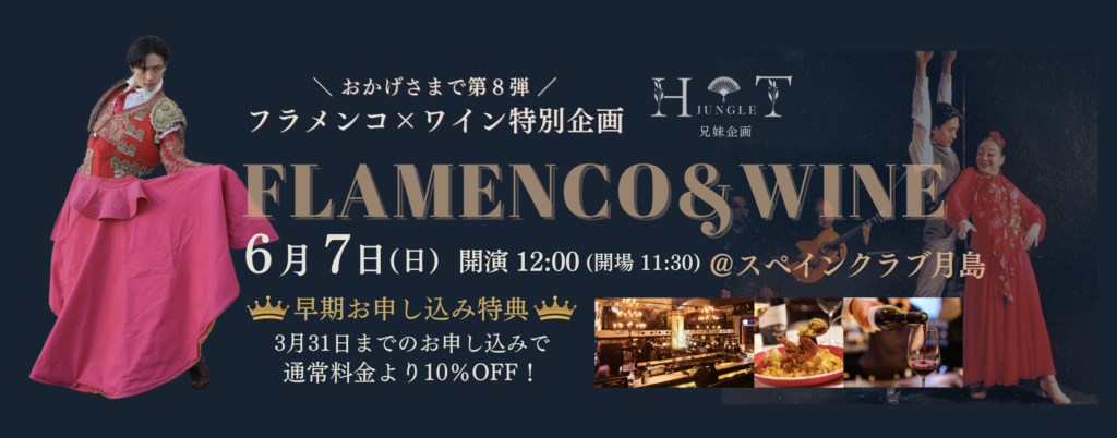スペインワインの魅力を、フラメンコのステージと共に、たっぷりとお楽しみいただければ嬉しいです。
